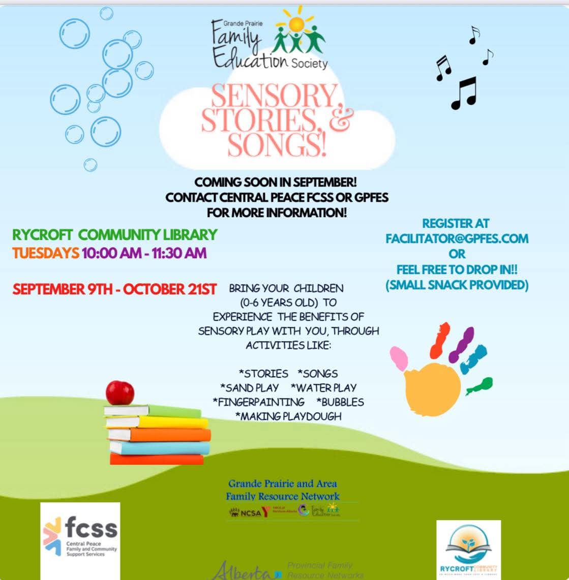 The Grande Prairie Family Education Society invite you to Sensory Stories and Songs, every Tuesday, at the Rycroft Library, from September 9, 2025 through to October 21, 2025.