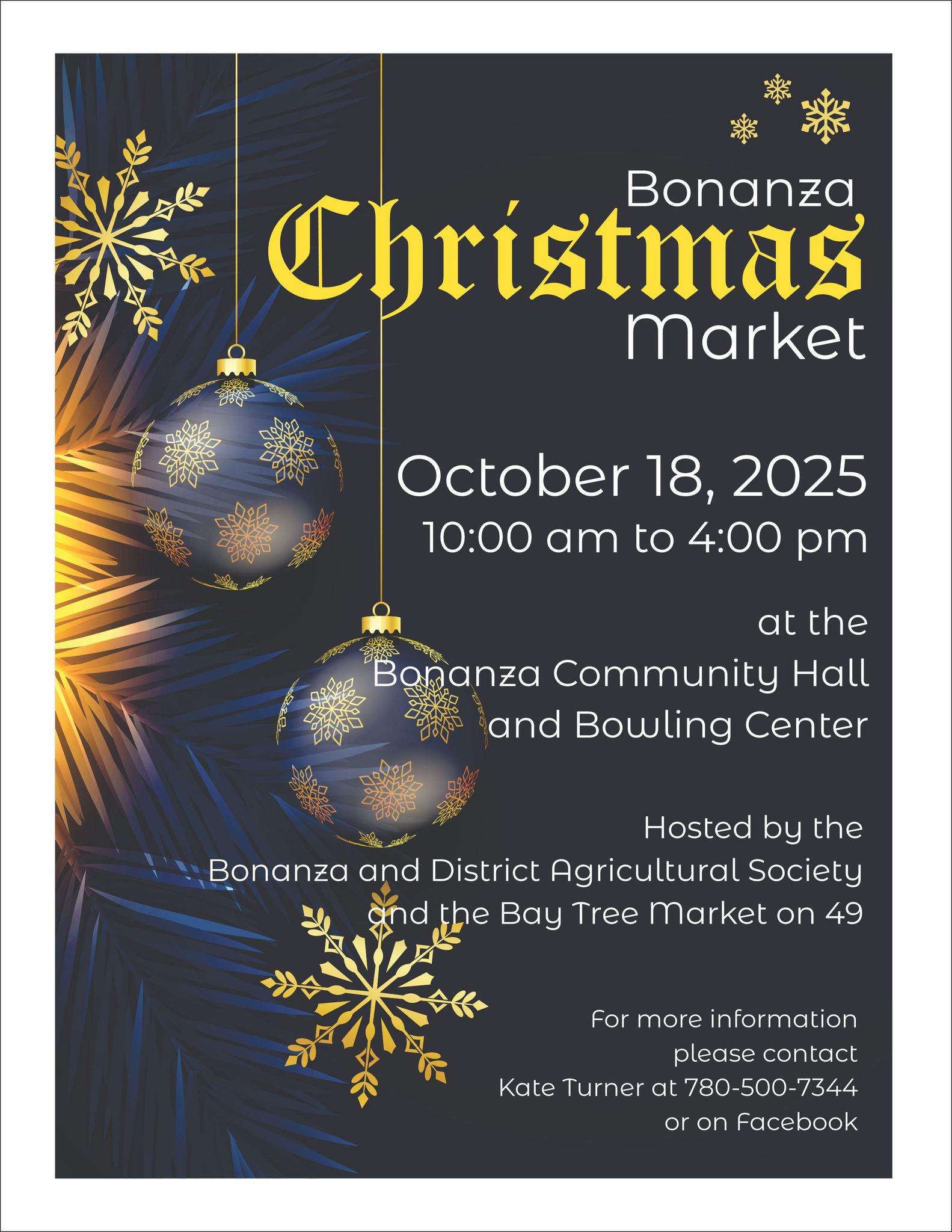 Start your Christmas shopping early, at the Bonanza Christmas Market, on October 18, 2025, from 10 a.m. to 4 p.m., at the Bonanza Community Hall.