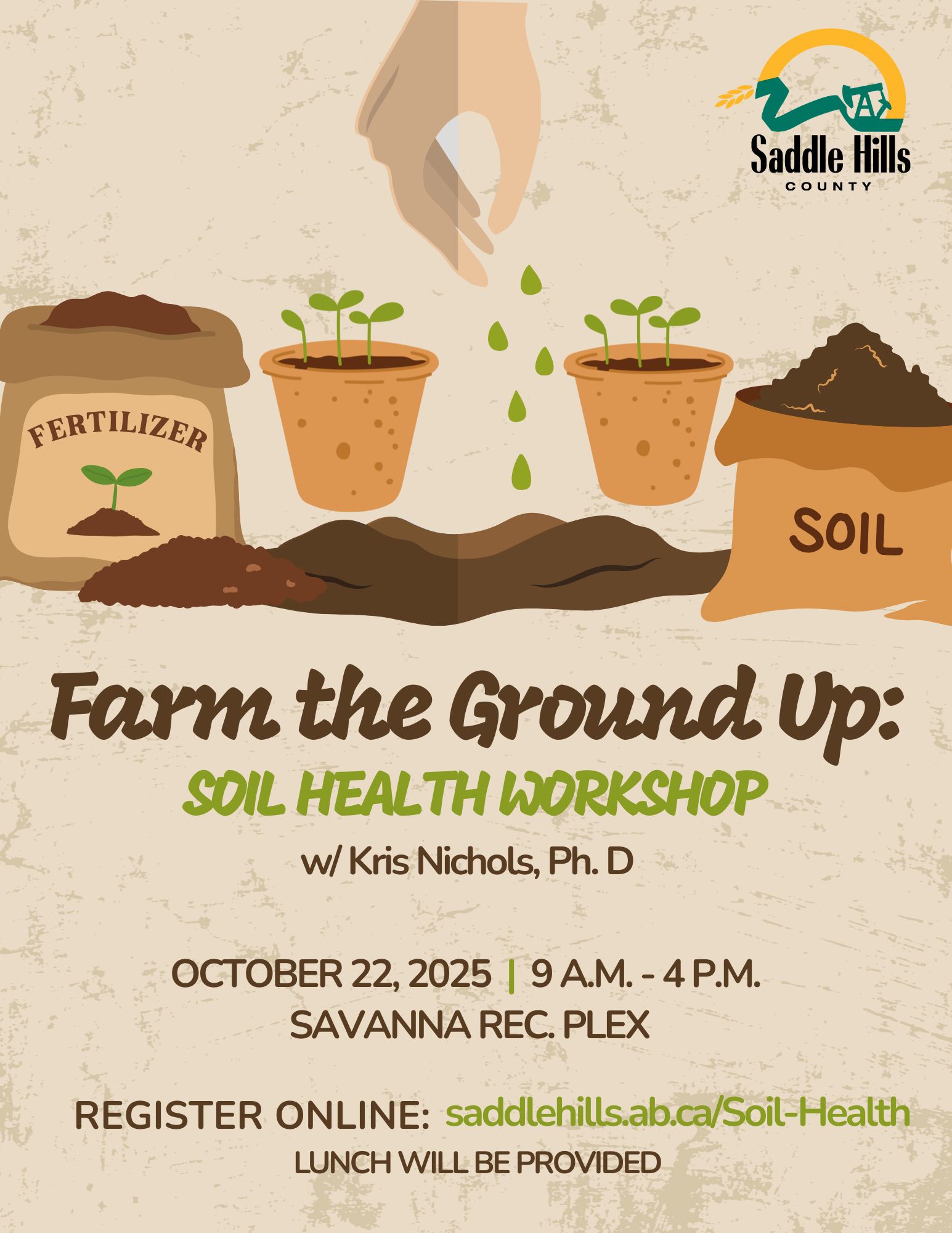 Saddle Hills County and the Savanna Ag Society are hosting Farm The Ground Up, a Soil Health Workshop, at the Savanna Rec. Plex, on October 22, 2025, from 9 a.m. - 4 p.m., with Kris Nichols, Ph.D. from the Food Water Wellness Foundation.