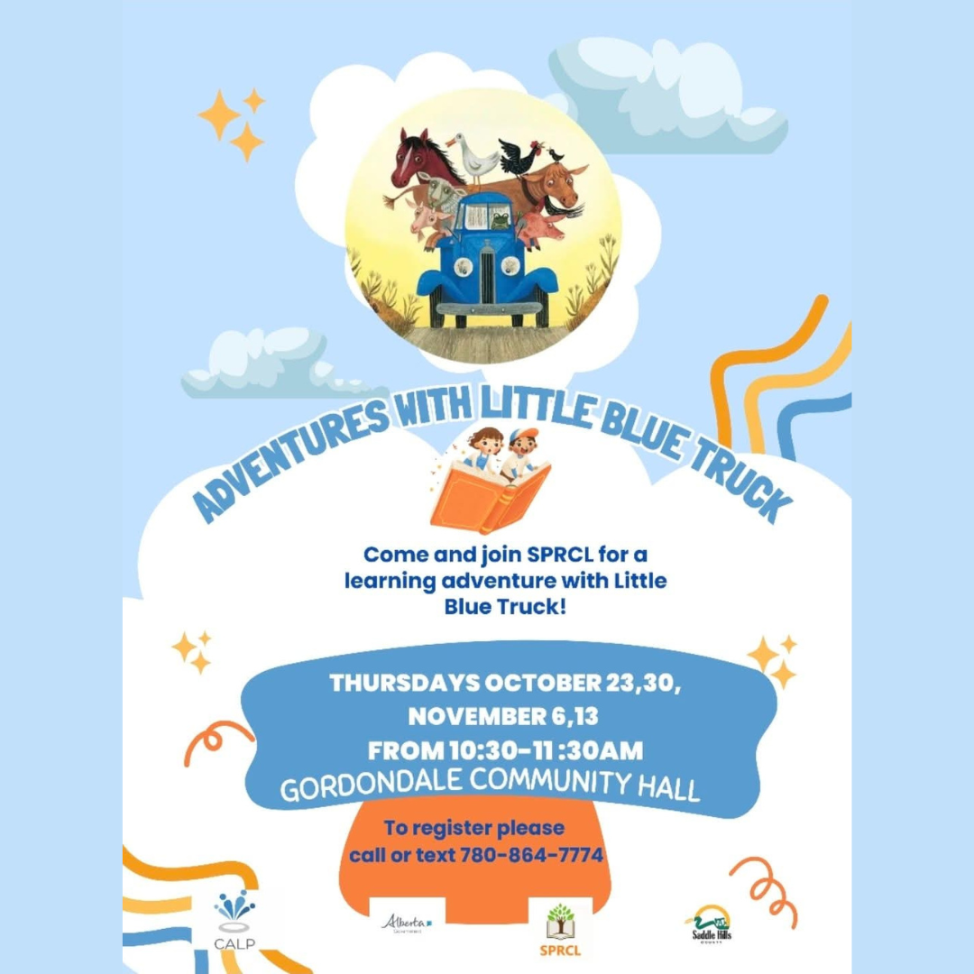 Join South Peace Rural Community Learning (SPRCL) for a learning adventure with Little Blue Truck, at the Gordondale Community Hall. The program will run on Thursday's, from 10:30 - 11:30 a.m, beginning October 23, 2025 and ending November 13, 2025.