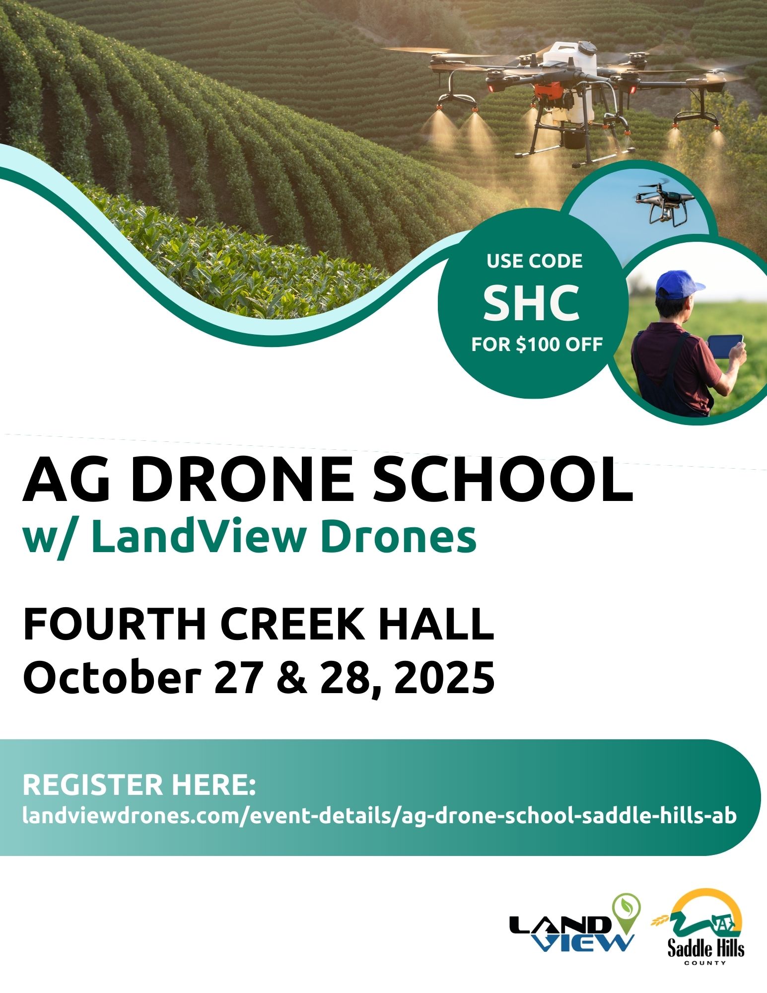 Join Saddle Hills County for Ag Drone School, a two day hands-on workshop, hosted by LandView Drones!